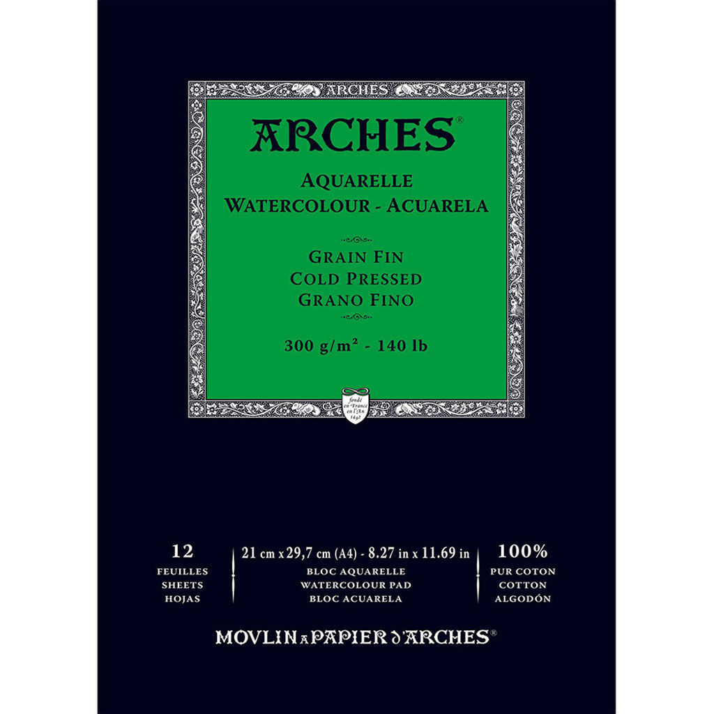 Arches Suluboya Blokları, uygun bloklar halinde kesilmiş ve siyah bir tutkalla yapıştırılmış doğal beyaz, kalıp yapımı suluboya kağıdı içerir. Blok başına 20 yaprak 140 lb (300 gsm) kağıt ve ilk katman olarak siyah bir koruyucu tabaka vardır. Başlamak için bu tabakayı çıkarın. Çeşitli boyutlarda Cold Press blokları 10 yapraklı, 300 lb (640 gsm) olarak da mevcuttur.