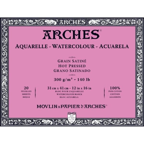 Arches Suluboya Blokları, uygun bloklar halinde kesilmiş ve siyah bir tutkalla yapıştırılmış doğal beyaz, kalıp yapımı suluboya kağıdı içerir. Blok başına 20 yaprak 140 lb (300 gsm) kağıt ve ilk katman olarak siyah bir koruyucu tabaka vardır. Başlamak için bu tabakayı çıkarın. Çeşitli boyutlarda Cold Press blokları 10 yapraklı, 300 lb (640 gsm) olarak da mevcuttur.