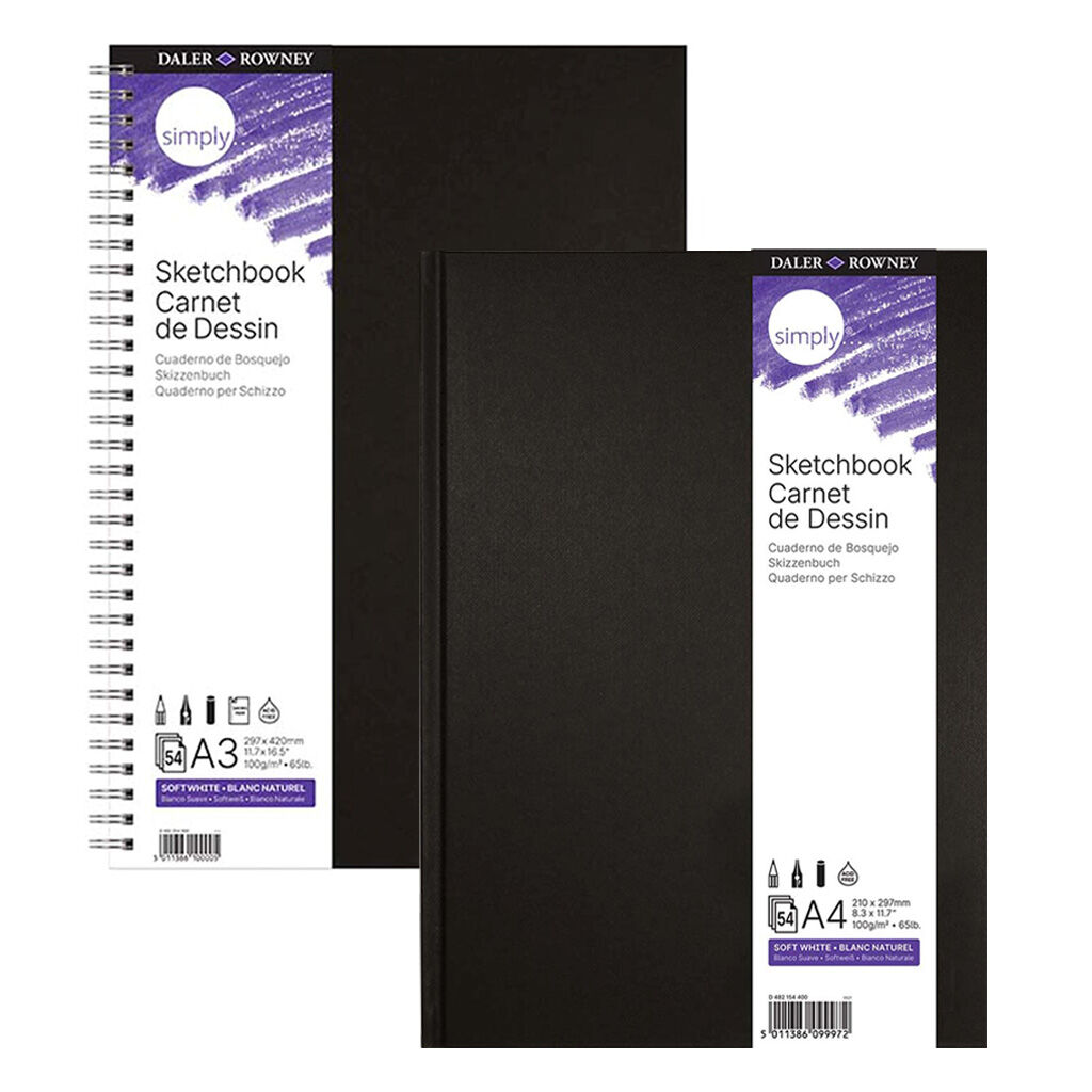 Daler-Rowney Simply Eskiz Defterleri, kompakt bir günlük eskiz defterleri yelpazesinden oluşur. Yumuşak beyaz veya ekstra beyaz orta grenli kağıtla. Simply Sketchbook'lar, siyah veya renkli kapaklarla hem ciltli hem de spiral ciltli formatlarda çeşitli boyutlarda mevcuttur.