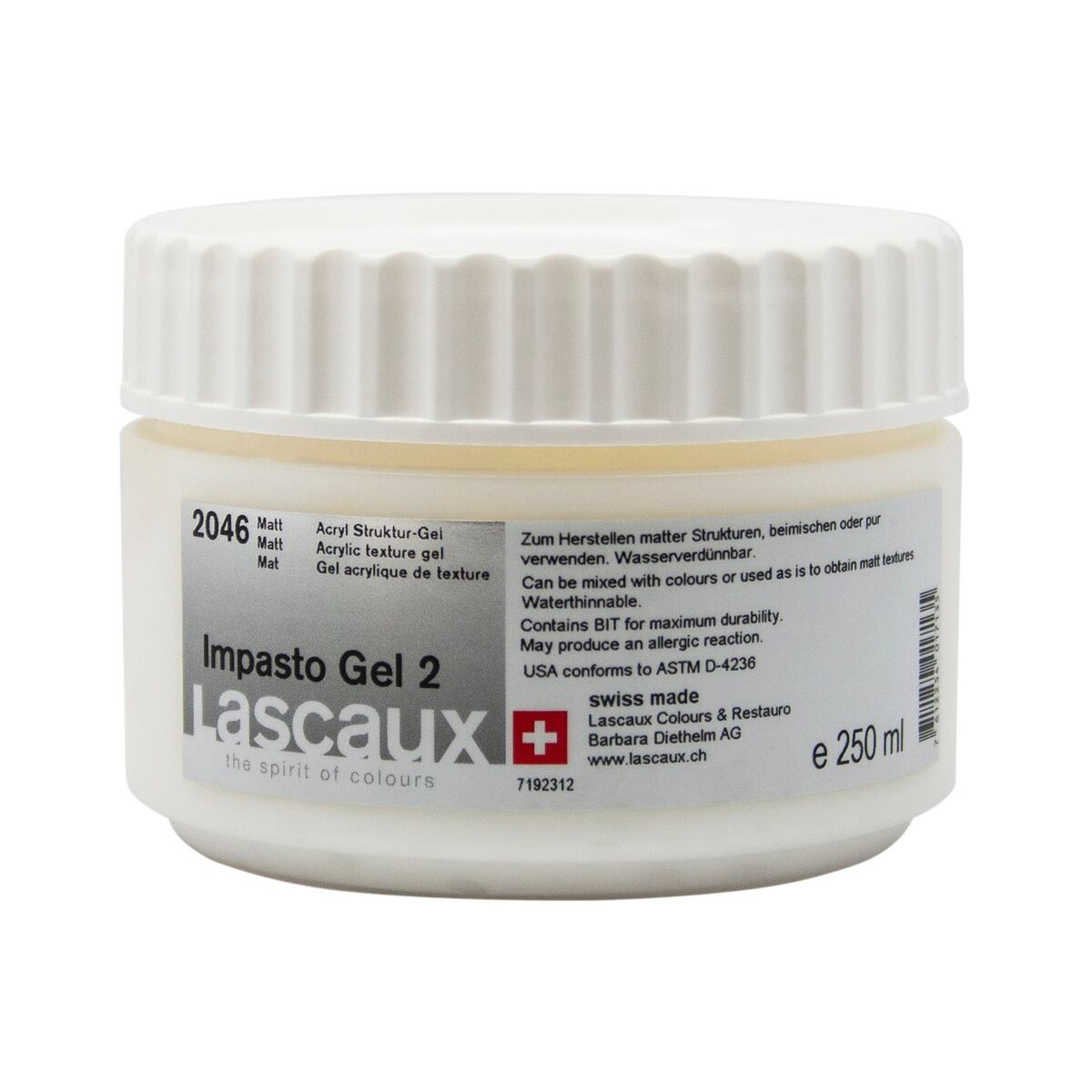 Kristal berraklığında ve mat bir yüzey oluşturur. Lascaux Impasto Gel 2, akrilik renkler için bir modelleme macunu ve aynı zamanda bir pasta ortamı olarak hizmet ederek onları parlak, şeffaf ve mat hale getirir. Berrak, suya dayanıklı bir yüzey elde etmek için kurur viskoplastik ve esnek kalır ışığa ve eskimeye karşı dirençli sararmaz iyi yapışma, sertlik ve aşınmaya karşı direnç kuruma süresini uzatır