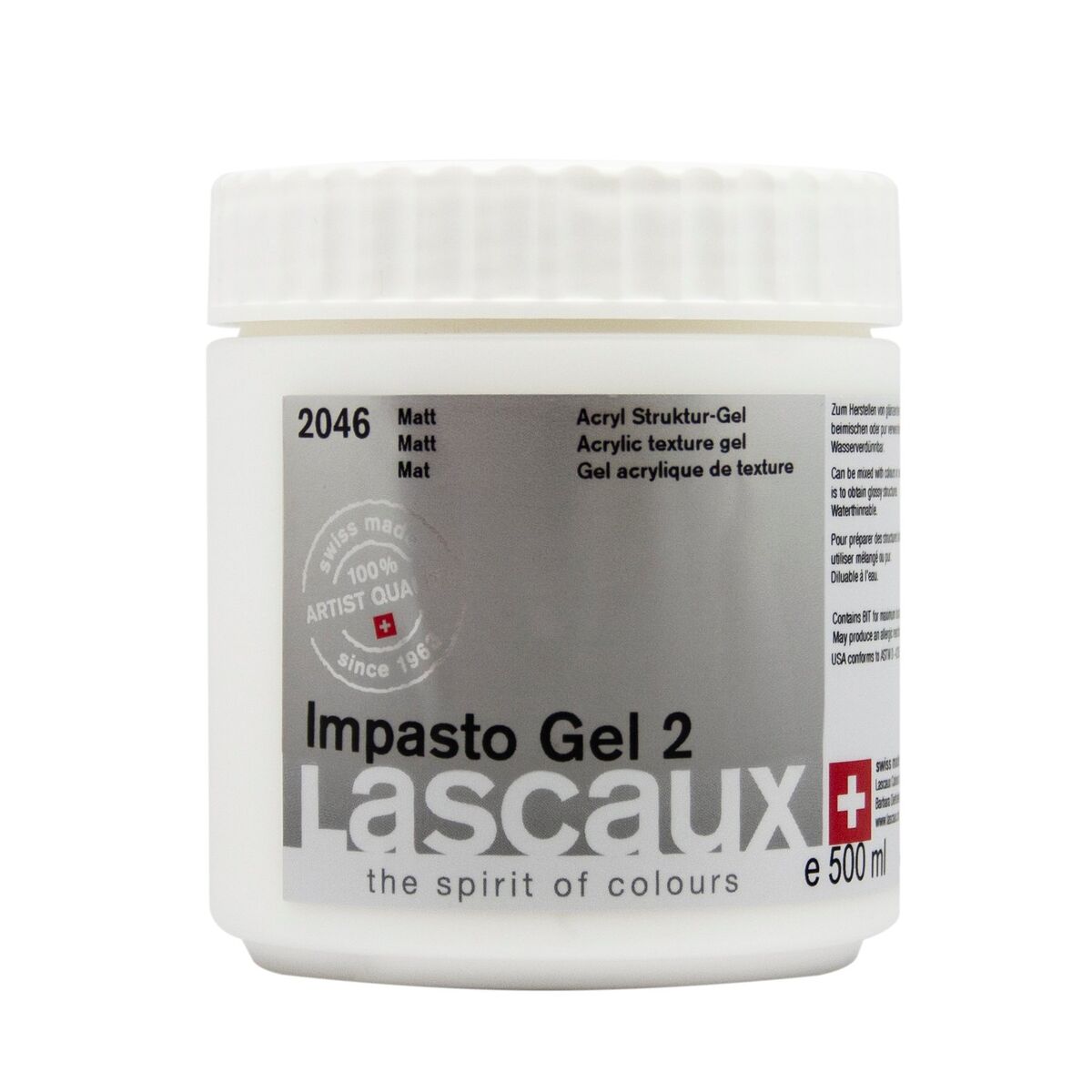 Kristal berraklığında ve mat bir yüzey oluşturur. Lascaux Impasto Gel 2, akrilik renkler için bir modelleme macunu ve aynı zamanda bir pasta ortamı olarak hizmet ederek onları parlak, şeffaf ve mat hale getirir. Berrak, suya dayanıklı bir yüzey elde etmek için kurur viskoplastik ve esnek kalır ışığa ve eskimeye karşı dirençli sararmaz iyi yapışma, sertlik ve aşınmaya karşı direnç kuruma süresini uzatır