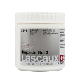 Kristal berraklığında, saten bir yüzey oluşturur. Lascaux Impasto Gel 3, akrilik renkleri parlak, şeffaf ve saten hale getiren bir modelleme macunu ve aynı zamanda bir pasta ortamı olarak hizmet eder. Berrak, suya dayanıklı bir yüzey elde etmek için kurur viskoplastik ve esnek kalır ışığa ve eskimeye karşı dirençli sararmaz iyi yapışma, sertlik ve aşınmaya karşı direnç kuruma süresini uzatır