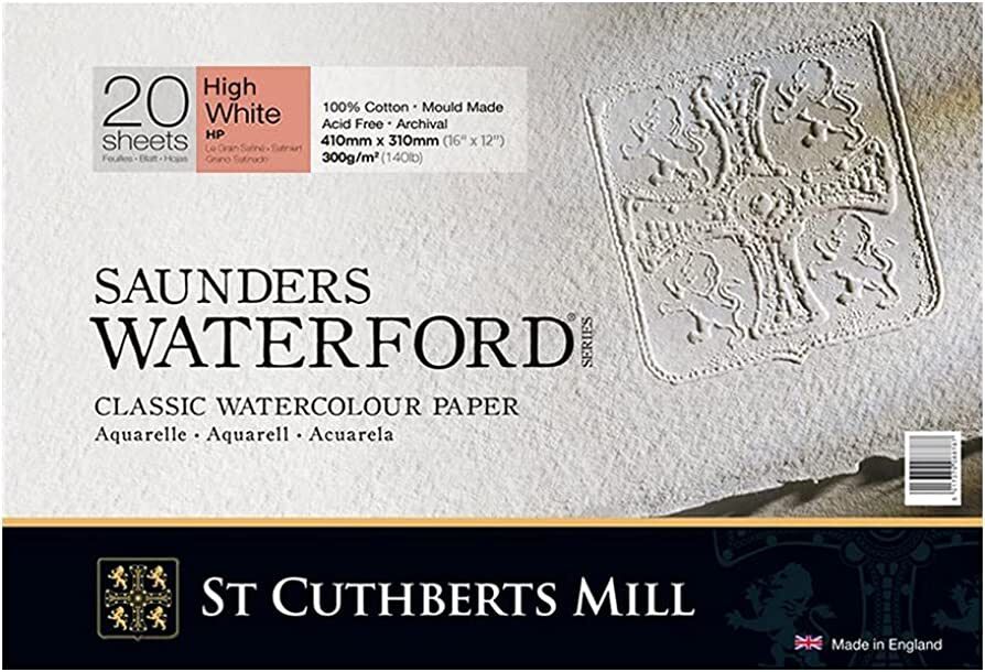 Saunders Waterford®, geleneksel olarak bir silindir kalıp makinesinde yapılan mükemmel bir sulu boya kağıdıdır. Bu, St Cuthberts Mill tarafından yapılan üstün kaliteli suluboya kağıdıdır ve Royal Suluboya Derneği'nin onayıyla birlikte gelir. En yüksek kalitede kağıt yapım malzemesi olan %100 pamuk kullanılarak yüksek arşiv standartlarına göre yapılmıştır. Her tabaka, bitmiş iş parçalarını atmosferik kirlilikte bulunan asitlerin neden olduğu renk solmasına karşı korumaya yardımcı olmak için kalsiyum karbonat ile tamponlanmıştır.