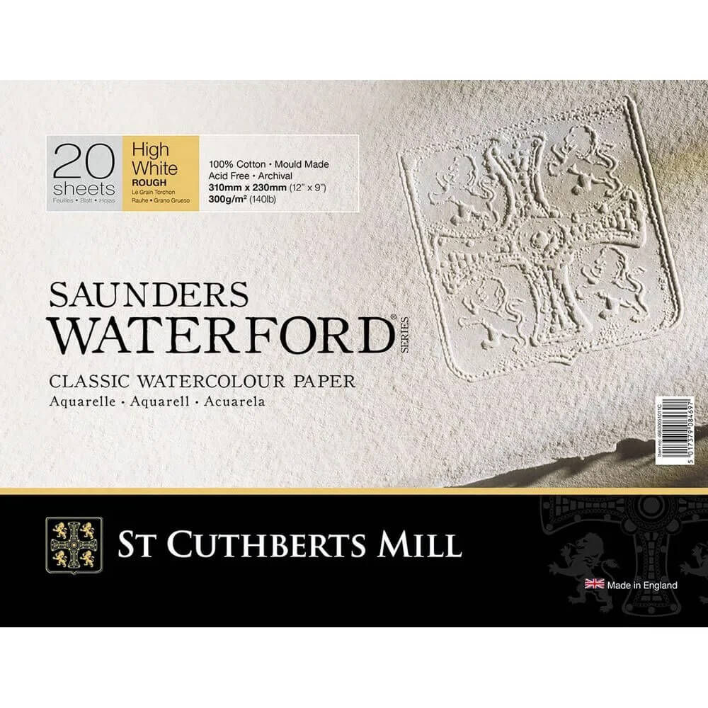 Saunders Waterford®, geleneksel olarak bir silindir kalıp makinesinde yapılan mükemmel bir sulu boya kağıdıdır. Bu, St Cuthberts Mill tarafından yapılan üstün kaliteli suluboya kağıdıdır ve Royal Suluboya Derneği'nin onayıyla birlikte gelir. En yüksek kalitede kağıt yapım malzemesi olan %100 pamuk kullanılarak yüksek arşiv standartlarına göre yapılmıştır. Her tabaka, bitmiş iş parçalarını atmosferik kirlilikte bulunan asitlerin neden olduğu renk solmasına karşı korumaya yardımcı olmak için kalsiyum karbonat ile tamponlanmıştır.