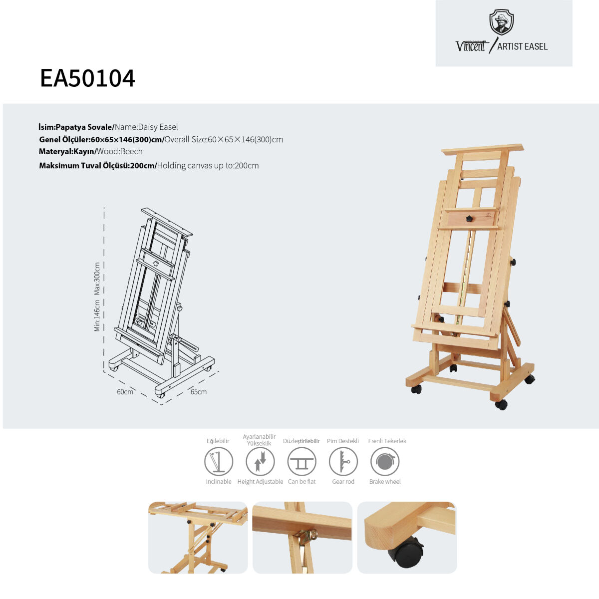 Gelince Haber VerPapatya, çok büyük ölçekli ve ağır sanatsal projeler için tasarlanmış, üst segment bir profesyonel stüdyo şövalesidir. Masif kayın ağacından üretilen gövdesi, 300 cm'ye kadar ulaşabilen yüksekliği ve sağlam taban yapısıyla atölye ortamında maksimum stabilite sağlar. Özellikle anıtsal boyuttaki tuvallerle çalışan sanatçılar için güvenli ve ergonomik bir üretim zemini sunar.