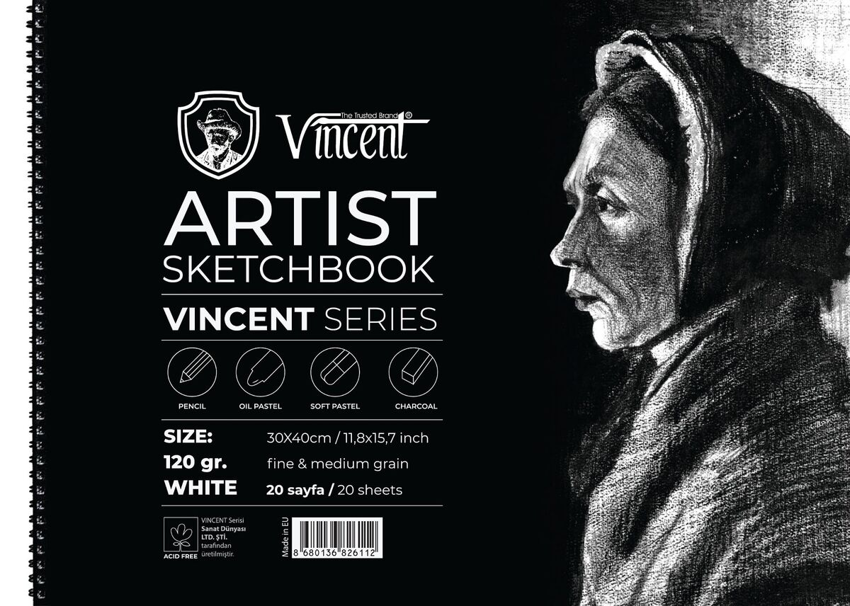 VINCENT ARTIST Sketchbook Avrupada üretilen asitsiz beyaz 120gr kağıtlardan yapılmaktadır. Spiral ciltlidir. Karton kapak, 2mm mukavva altlık. Eskiz çalışmalarında, toz pastel, yağlı pastel ve kömür için ideal kağıda sahiptir.