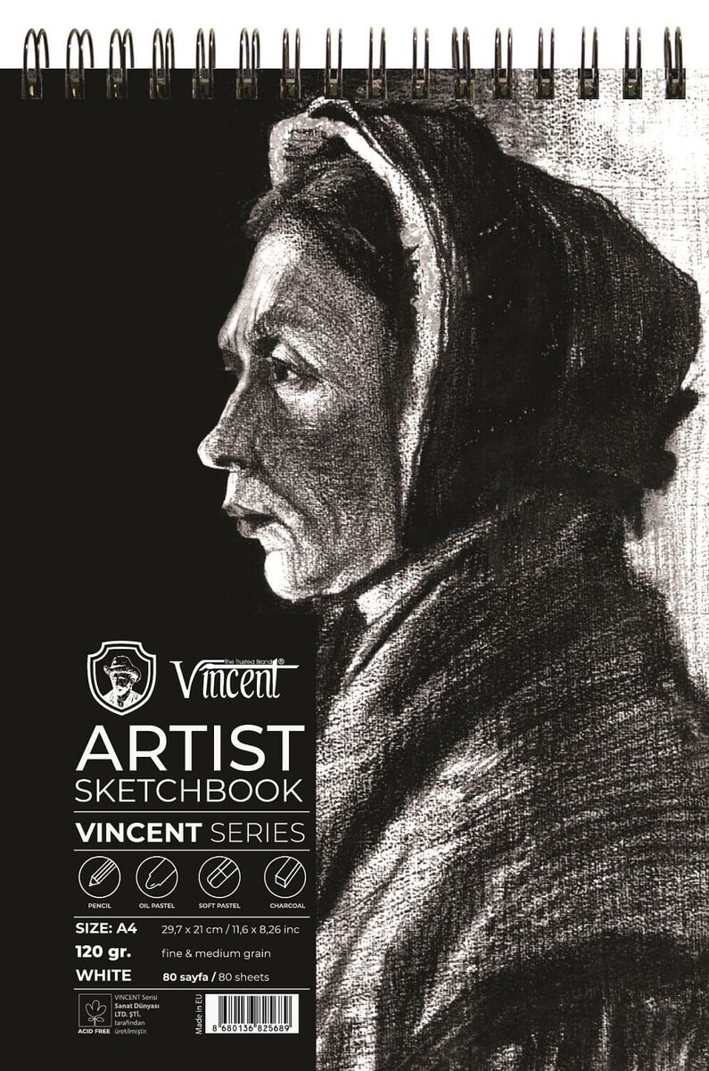 VINCENT ARTIST Sketchbook Avrupada üretilen asitsiz beyaz 120gr kağıtlardan yapılmaktadır. Spiral ciltlidir. Karton kapak, 2mm mukavva altlık. Eskiz çalışmalarında, toz pastel, yağlı pastel ve kömür için ideal kağıda sahiptir.