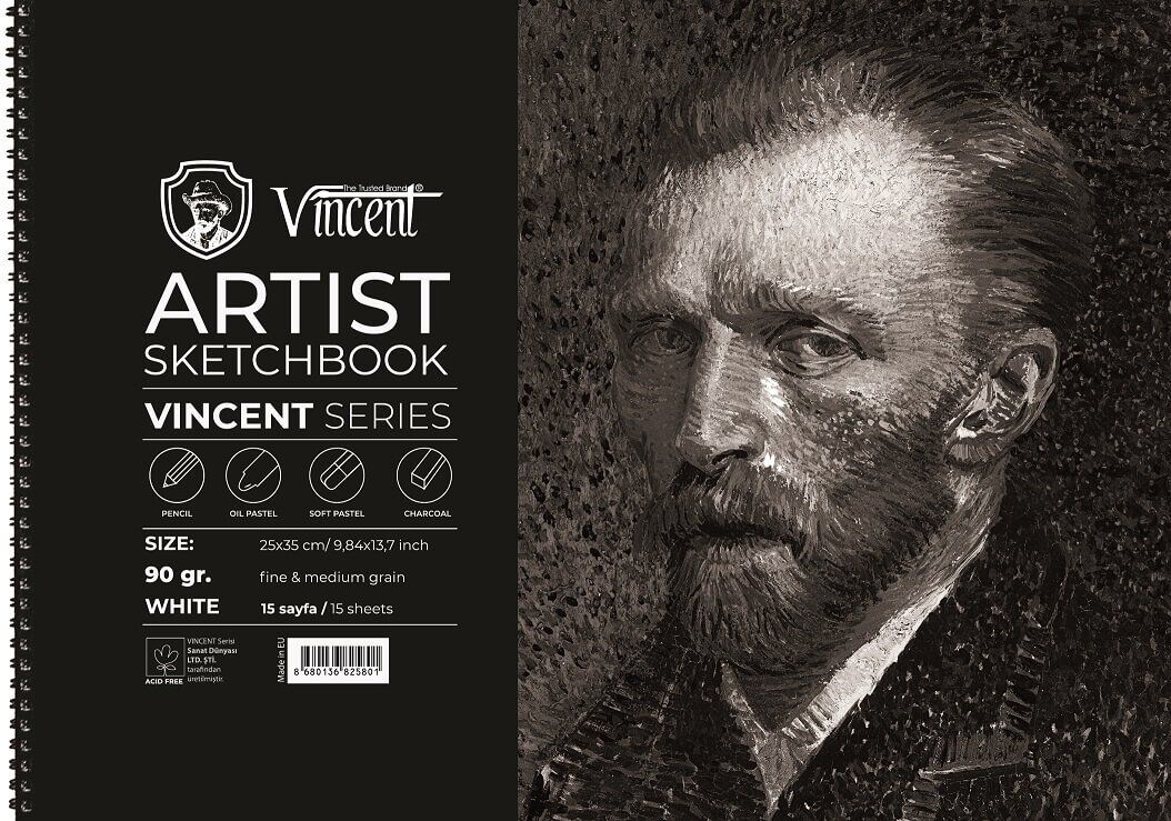 VINCENT ARTIST Sketchbook Avrupada üretilen asitsiz beyaz 90gr kağıtlardan yapılmaktadır. Spiral ciltlidir. Karton kapak, 2mm mukavva altlık. Eskiz çalışmalarında, toz pastel, yağlı pastel ve kömür için ideal kağıda sahiptir.