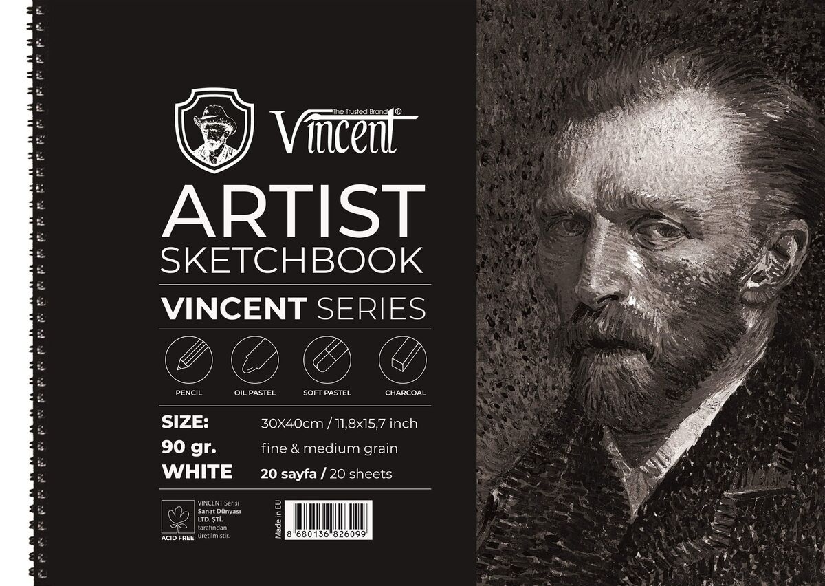 VINCENT ARTIST Sketchbook Avrupada üretilen asitsiz beyaz 90gr kağıtlardan yapılmaktadır. Spiral ciltlidir. Karton kapak, 2mm mukavva altlık. Eskiz çalışmalarında, toz pastel, yağlı pastel ve kömür için ideal kağıda sahiptir.