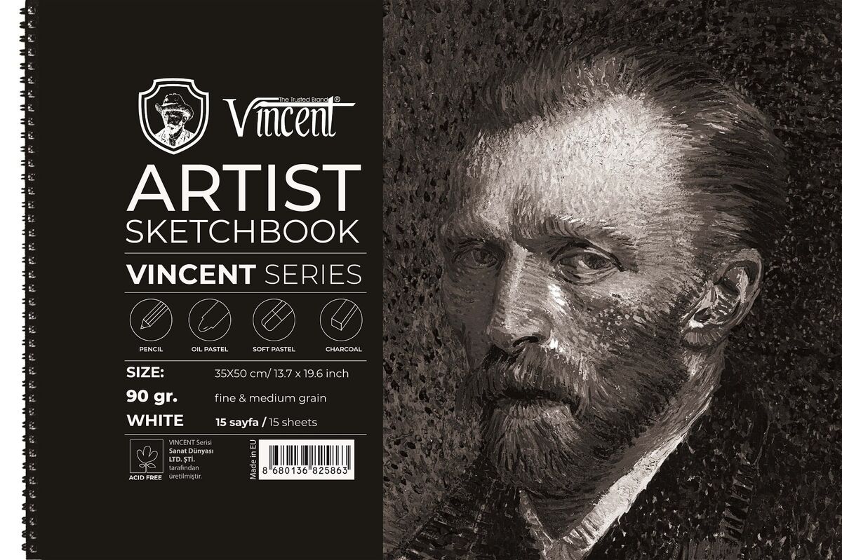 VINCENT ARTIST Sketchbook Avrupada üretilen asitsiz beyaz 90gr kağıtlardan yapılmaktadır. Spiral ciltlidir. Karton kapak, 2mm mukavva altlık. Eskiz çalışmalarında, toz pastel, yağlı pastel ve kömür için ideal kağıda sahiptir.