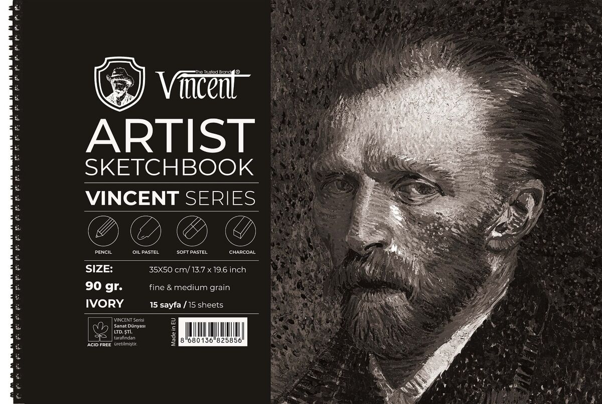 VINCENT ARTIST Sketchbook Avrupada üretilen asitsiz beyaz 90gr kağıtlardan yapılmaktadır. Spiral ciltlidir. Karton kapak, 2mm mukavva altlık. Eskiz çalışmalarında, toz pastel, yağlı pastel ve kömür için ideal kağıda sahiptir.
