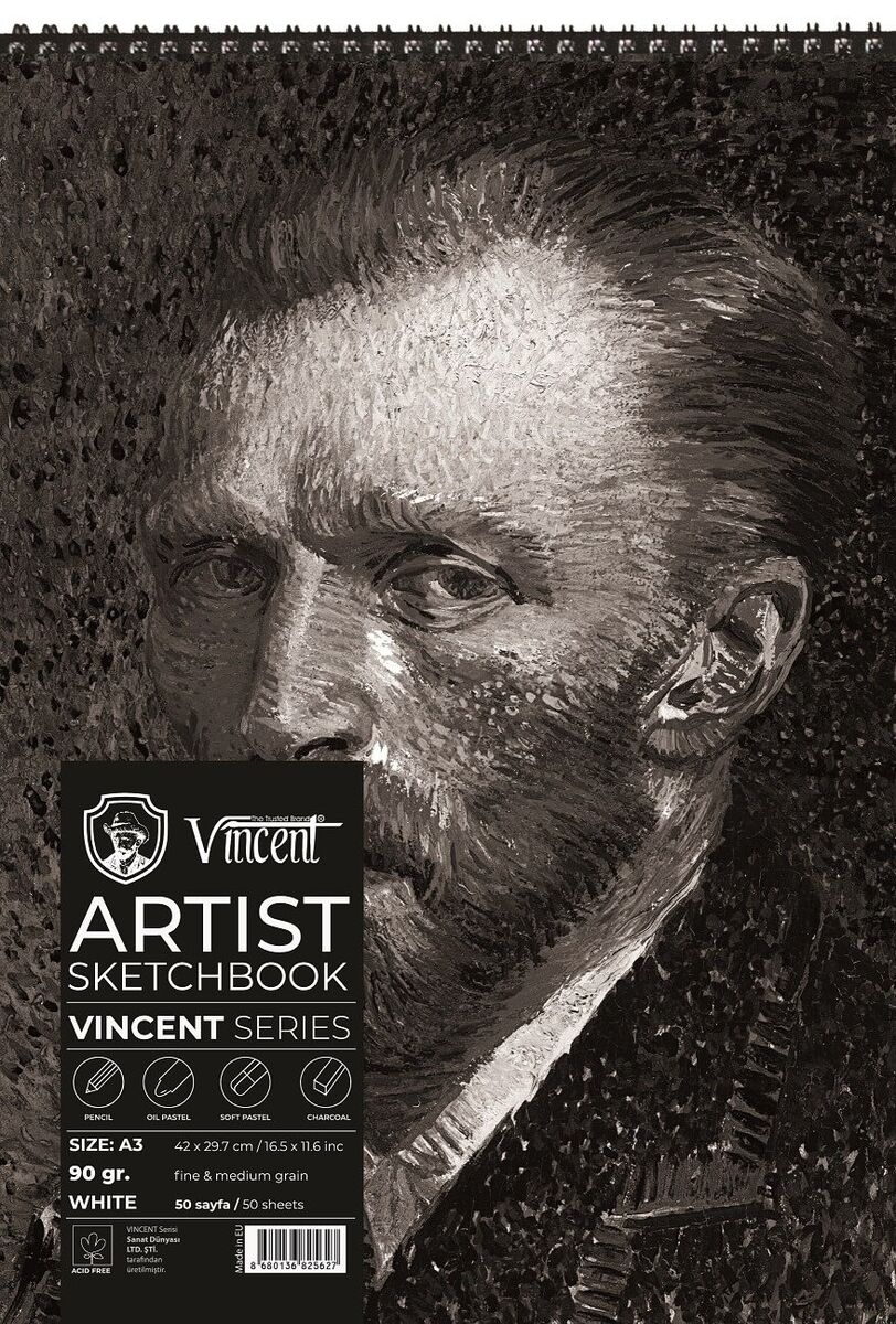 VINCENT ARTIST Sketchbook Avrupada üretilen asitsiz beyaz 90gr kağıtlardan yapılmaktadır. Spiral ciltlidir. Karton kapak, 2mm mukavva altlık. Eskiz çalışmalarında, toz pastel, yağlı pastel ve kömür için ideal kağıda sahiptir.