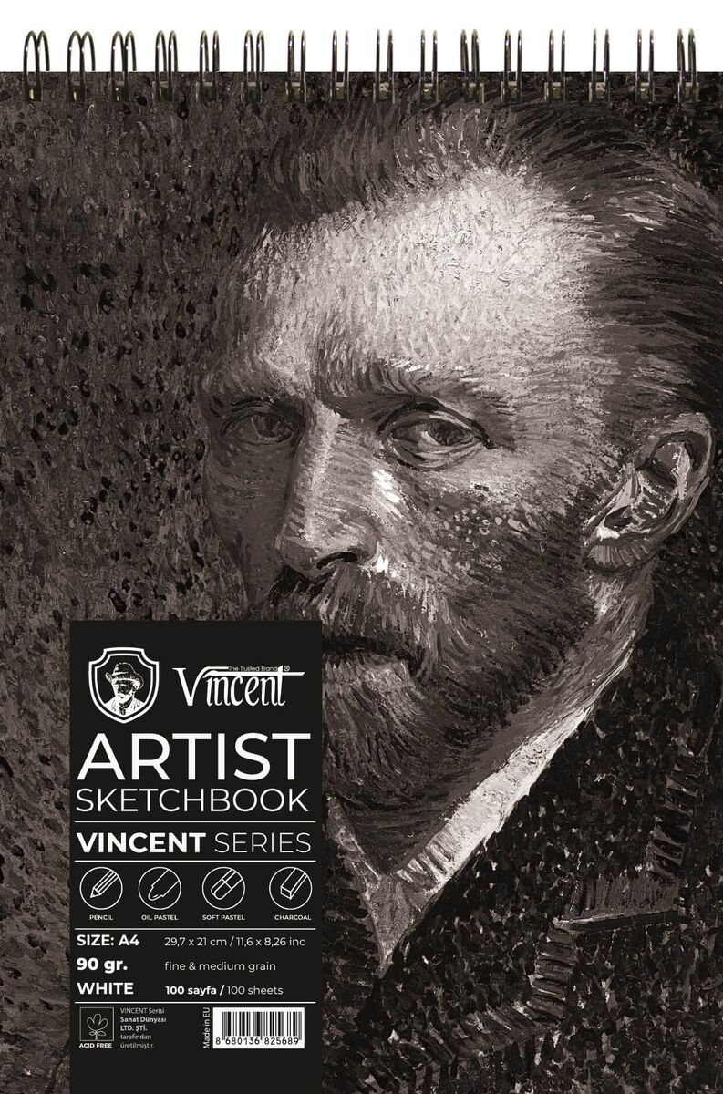 VINCENT ARTIST Sketchbook Avrupada üretilen asitsiz beyaz 90gr kağıtlardan yapılmaktadır. Spiral ciltlidir. Karton kapak, 2mm mukavva altlık. Eskiz çalışmalarında, toz pastel, yağlı pastel ve kömür için ideal kağıda sahiptir.
