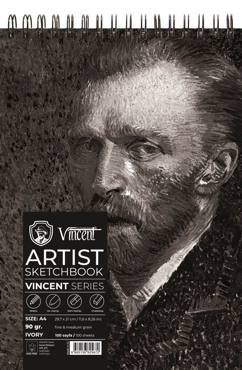 VINCENT ARTIST Sketchbook Avrupada üretilen asitsiz beyaz 90gr kağıtlardan yapılmaktadır. Spiral ciltlidir. Karton kapak, 2mm mukavva altlık. Eskiz çalışmalarında, toz pastel, yağlı pastel ve kömür için ideal kağıda sahiptir.