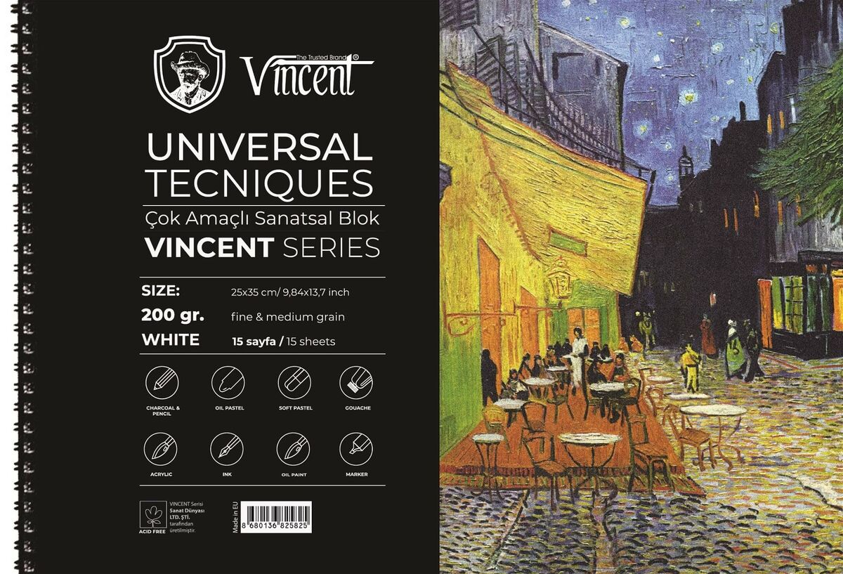 VINCENT UNIVERSAL TECNIQUES Avrupada üretilen asitsiz beyaz 200gr kağıtlardan yapılmaktadır. Spiral ciltlidir. Karton kapak, 2mm mukavva altlık. Eskiz çalışmalarında, toz pastel, yağlı pastel ve kömür için ideal kağıda sahiptir.