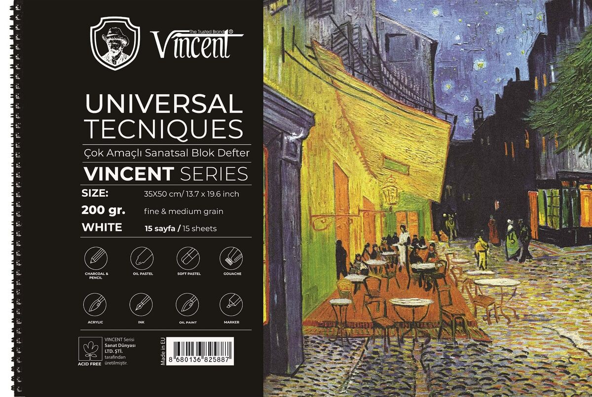 VINCENT UNIVERSAL TECNIQUES Avrupada üretilen asitsiz beyaz 200gr kağıtlardan yapılmaktadır. Spiral ciltlidir. Karton kapak, 2mm mukavva altlık. Eskiz çalışmalarında, toz pastel, yağlı pastel ve kömür için ideal kağıda sahiptir.