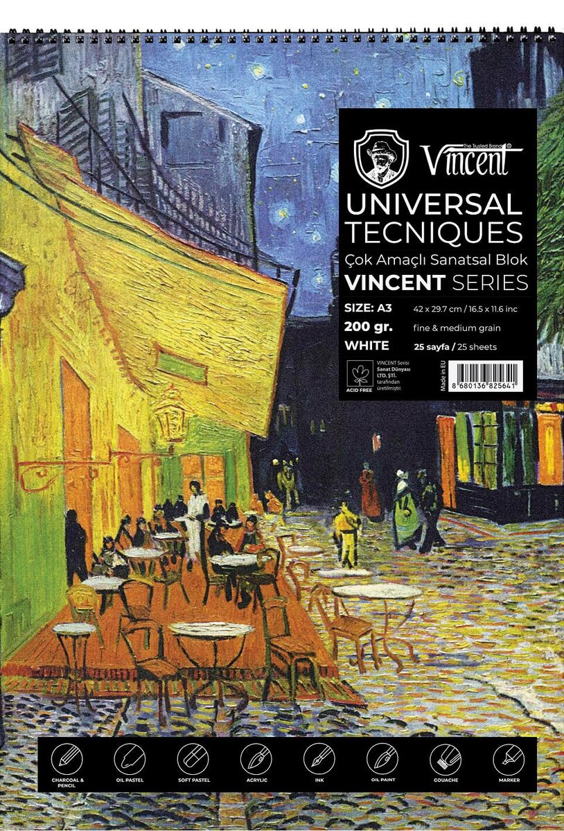 VINCENT UNIVERSAL TECNIQUES Avrupada üretilen asitsiz beyaz 200gr kağıtlardan yapılmaktadır. Spiral ciltlidir. Karton kapak, 2mm mukavva altlık. Eskiz çalışmalarında, toz pastel, yağlı pastel ve kömür için ideal kağıda sahiptir.