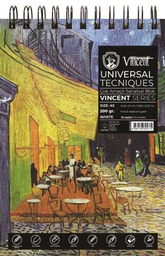 VINCENT UNIVERSAL TECNIQUES Avrupada üretilen asitsiz beyaz 200gr kağıtlardan yapılmaktadır. Spiral ciltlidir. Karton kapak, 2mm mukavva altlık. Eskiz çalışmalarında, toz pastel, yağlı pastel ve kömür için ideal kağıda sahiptir.