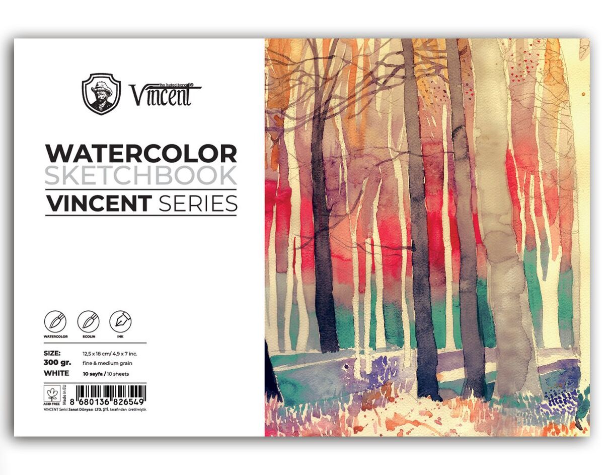 VINCENT WATERCOLOR Sketchbook Avrupada üretilen asitsiz beyaz 10 yaprak 300 gr defterlerdir. Karton kapak, 2 mm mukavva altlık. Suluboya, mürekkep, ecolin ve sıvı akrilik çalışmaları için uygundur.