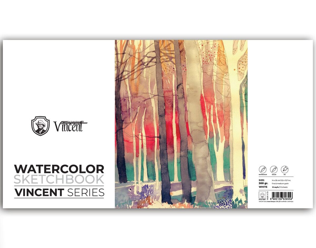 VINCENT WATERCOLOR Sketchbook Avrupada üretilen asitsiz beyaz 10 yaprak 300 gr defterlerdir. Karton kapak, 2 mm mukavva altlık. Suluboya, mürekkep, ecolin ve sıvı akrilik çalışmaları için uygundur.