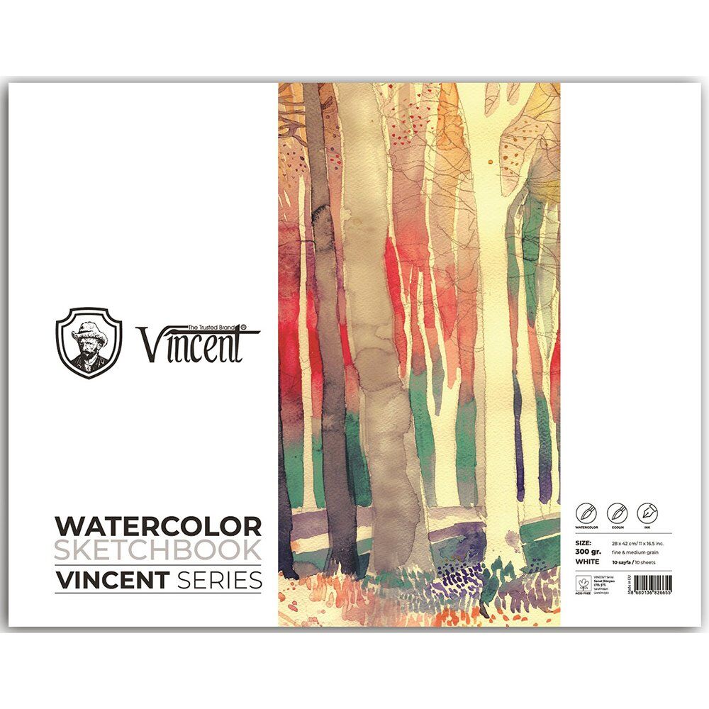 VINCENT WATERCOLOR Sketchbook Avrupada üretilen asitsiz beyaz 10 yaprak 300 gr defterlerdir. Karton kapak, 2 mm mukavva altlık. Suluboya, mürekkep, ecolin ve sıvı akrilik çalışmaları için uygundur.