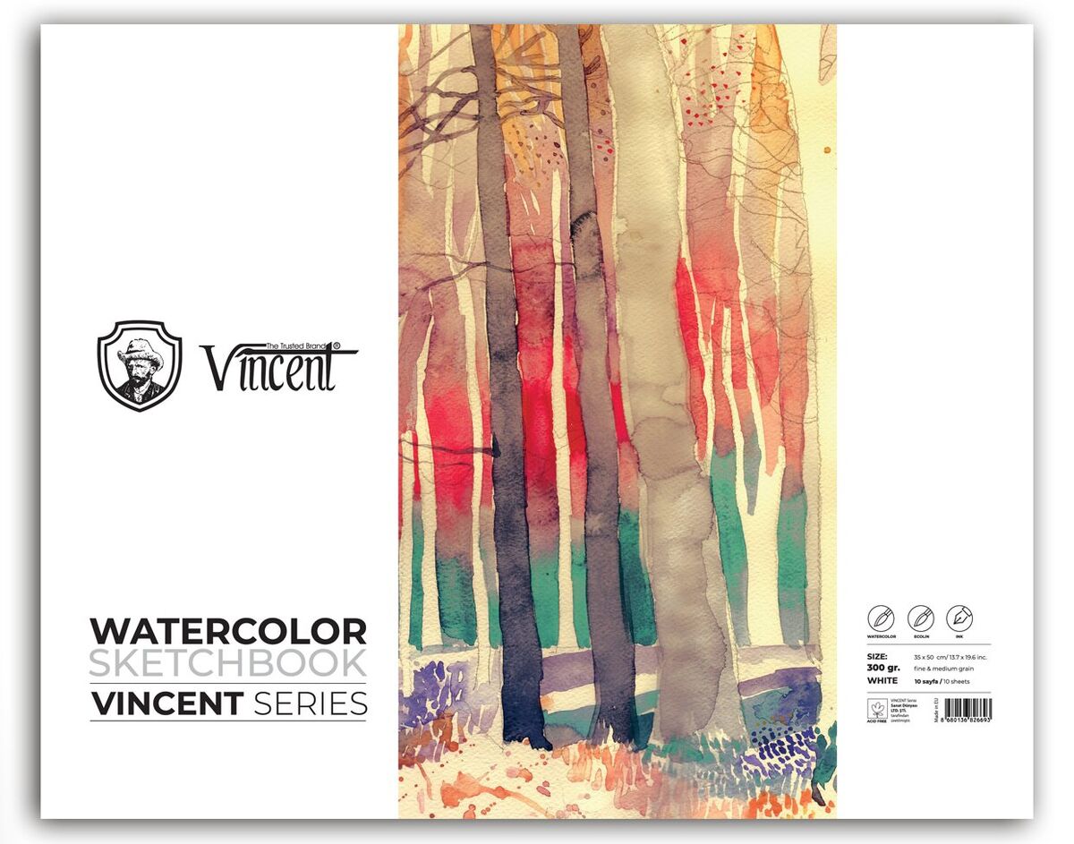 VINCENT WATERCOLOR Sketchbook Avrupada üretilen asitsiz beyaz 10 yaprak 300 gr defterlerdir. Karton kapak, 2 mm mukavva altlık. Suluboya, mürekkep, ecolin ve sıvı akrilik çalışmaları için uygundur.